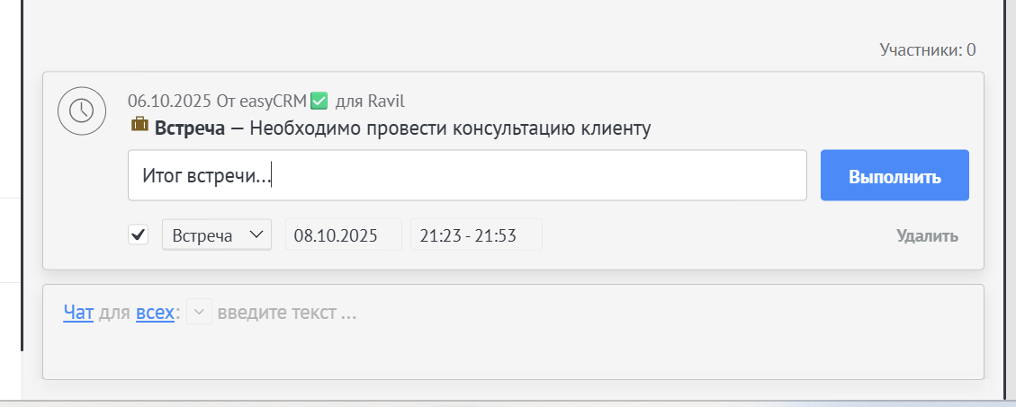Чтобы выполнить задачу нажмите на нее в сделке. Вам откроется поле, где нужно заполнить результат задачи: