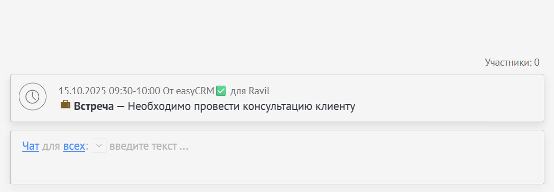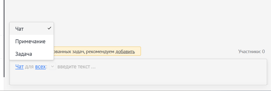 Чтобы поставить задачу в сделке, вам необходимо зайти в нее и внизу экрана навести курсор на "Чат". Затем вы нажимаете на "Задача"