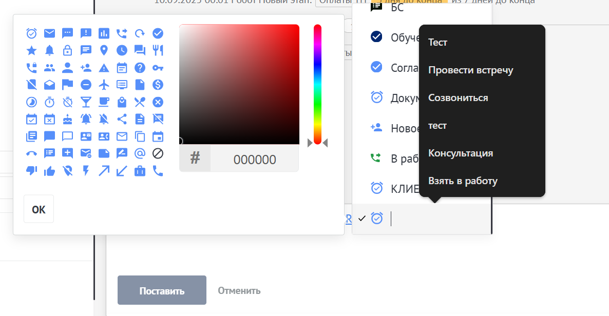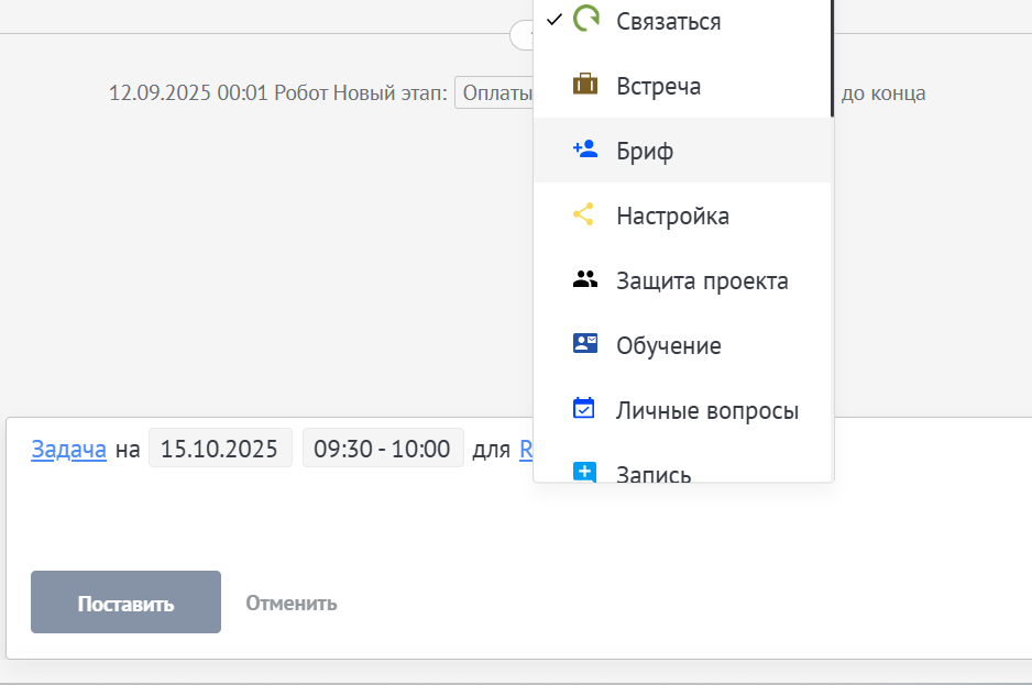 Следующим шагом будет выбор типа задачи. Чтобы его выбрать, вам нужно нажать на "Связаться". В выпадающем списке вы можете выбрать нужный тип или создать свой