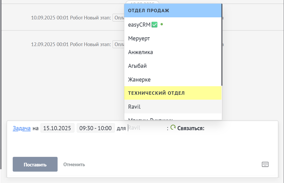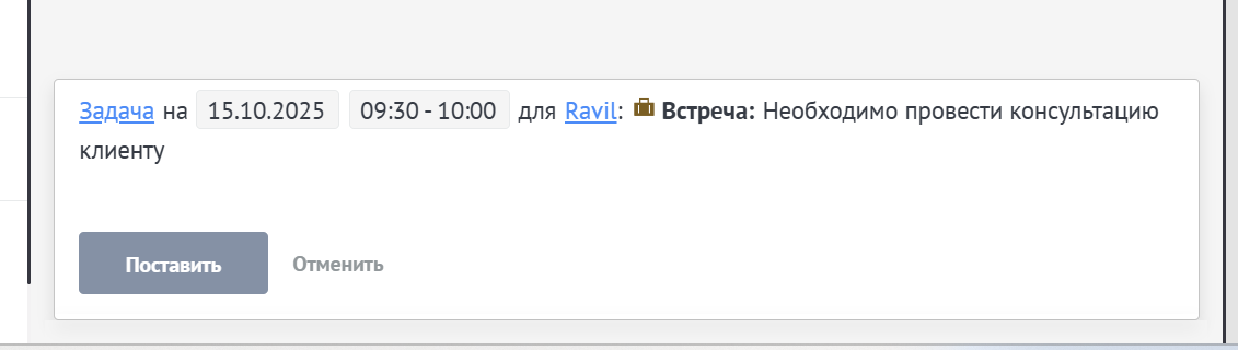 Поставленная задача отображается в сделке. Вы можете увидеть информацию о дедлайне, постановщике, исполнителе и содержании задачи2.