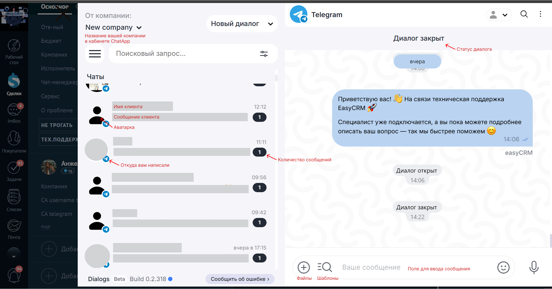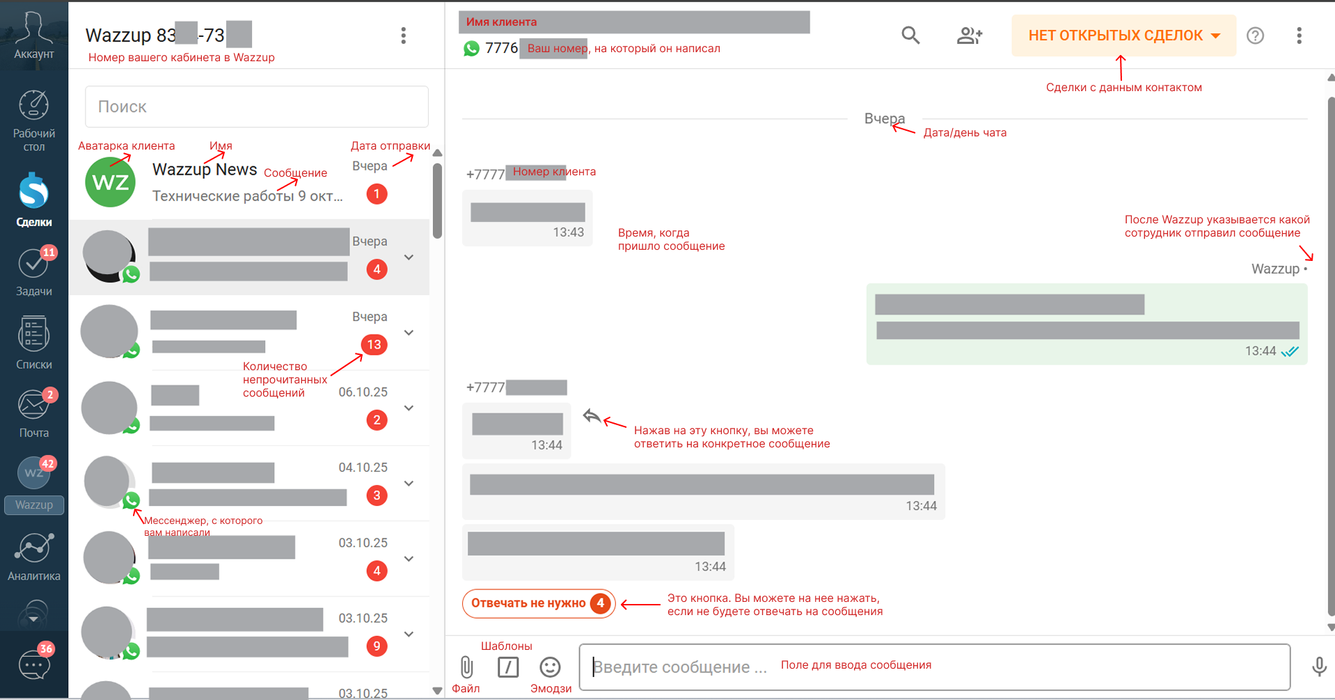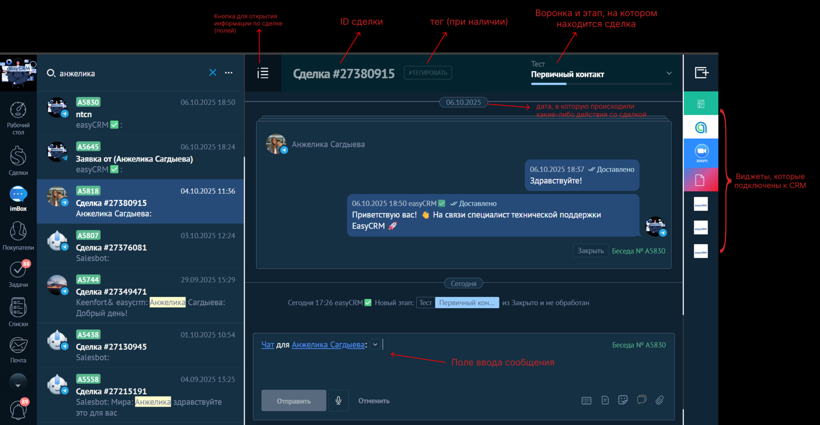 На открывшейся странице с левой стороны вы можете увидеть список чатов, посередине чат с выбранным клиентом, а справа виджеты сервисов, которые подключены к вашей CRM. Подробнее значение каждого элемента вы можете увидеть на скриншоте 3: