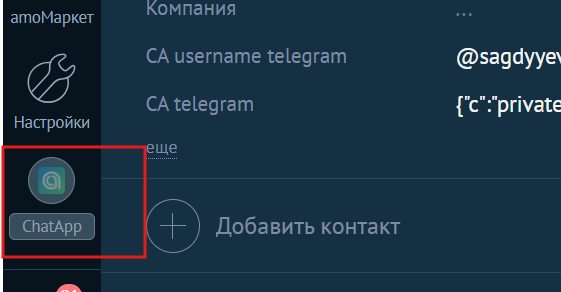 Принцип работы ChatApp практически такой же, как и у Wazzup. У вас также в левом меню будет виджет ChatApp, как изображен на скриншоте ниже:
