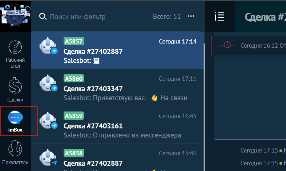 Скриншот 2. Расположение imBox в левом меню в amoCRM
