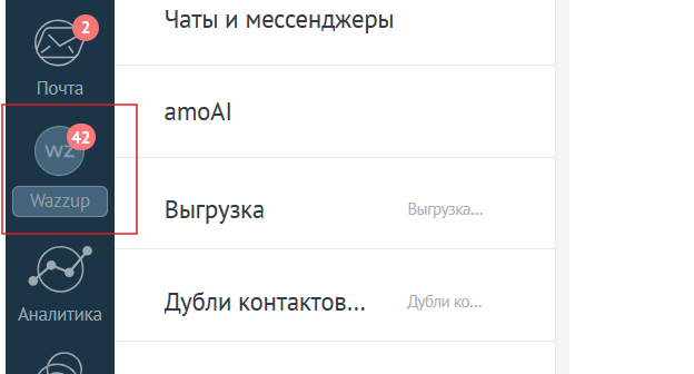Если у вас подключен WhatsApp или какой-либо другой мессенджер через Wazzup, то в вашей CRM в левом меню будет отображаться виджет данного сервиса, как указано на скриншоте 4: