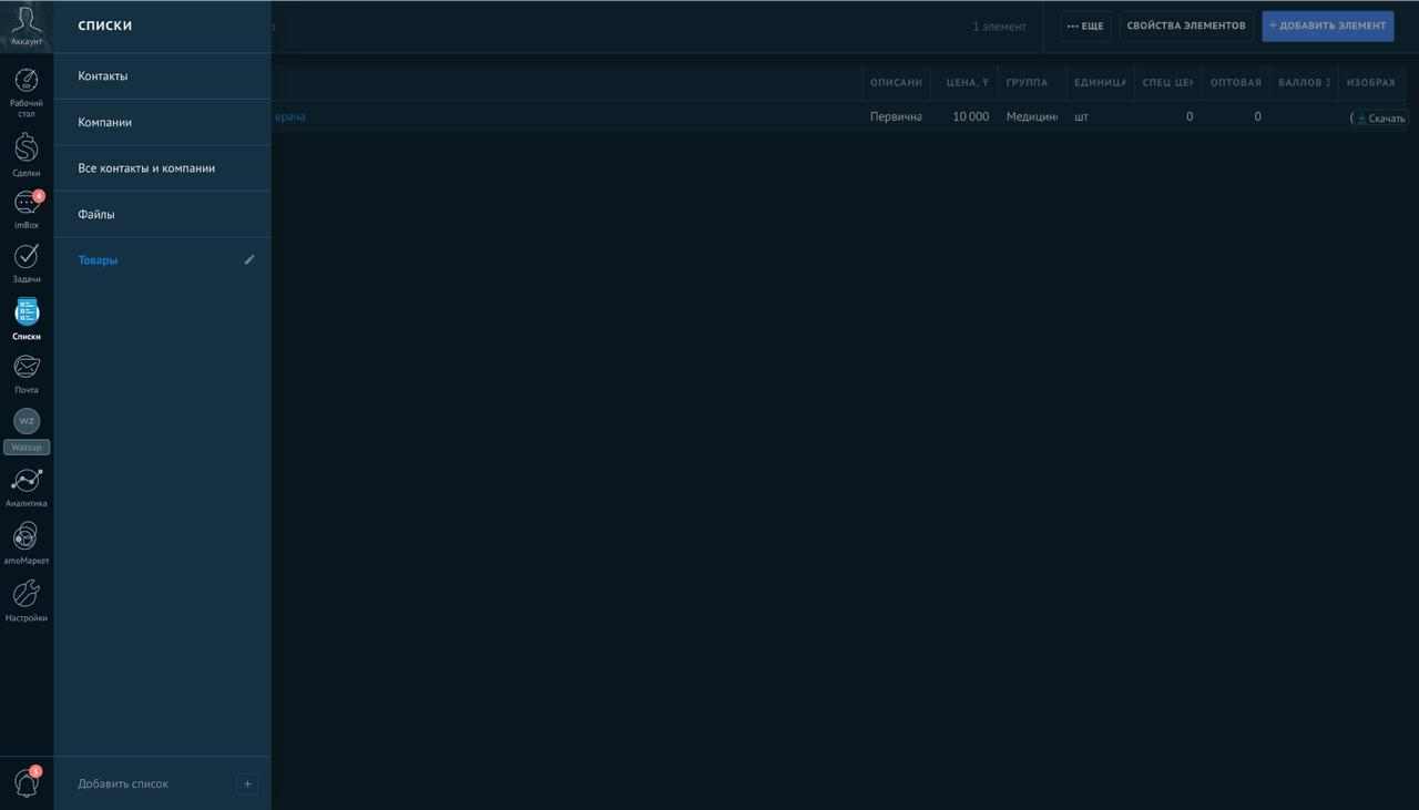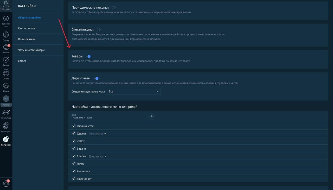 Раздел «Товары» находится в основном меню amoCRM: